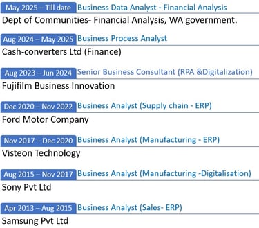 All activities as a Business Analyst from Requirement Gathering to Documentation, Process Mapping, Project timeline Negotiation, Business Process Improvement, Robotic Process Automation, Process Digitalization, Process Streamlining.